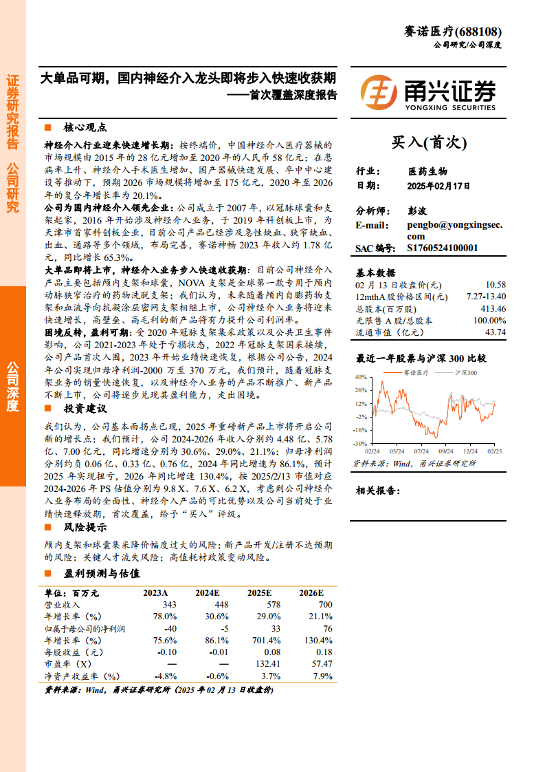 赛诺医疗(688108)首次覆盖深度报告:大单品可期,国内神经介入龙头即将步入快速收获期