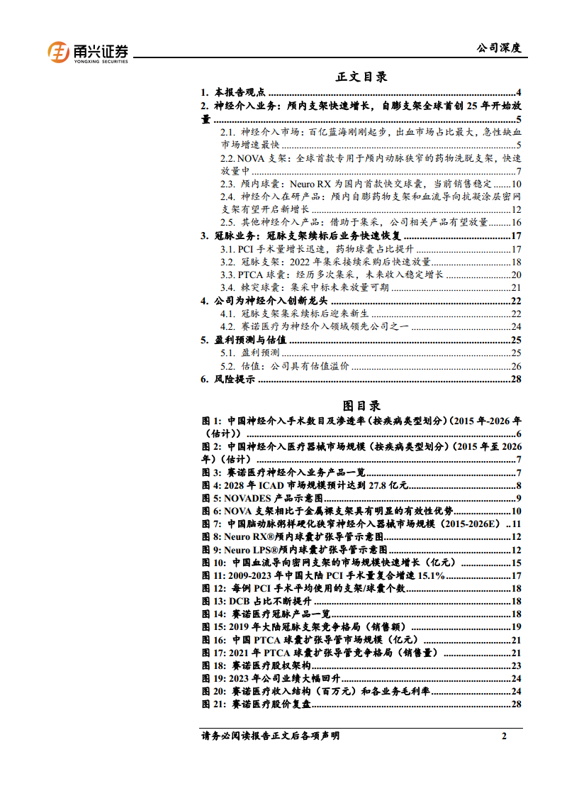 公司整体发展:困境反转与神经介入创新龙头地位 赛诺医疗成立于2007年,于2019年科创板上市。公司在2020年冠脉支架国采后,2021-2022年业绩大幅下滑并亏损。然而,随着2022年底冠脉支架国采续标中标以及神经介入业务的快速发展,公司业绩在2023年开始快速恢复,实现收入约3.43亿元,同比增长77.99%,归母净利润大幅减亏至亏损3963万元。2024年前三季度延续恢复趋势,收入约3.18亿元,同比增长30.20%,归母净利润亏损674万元。公司销售费用率和研发费用率在收入增长的带动下呈下降趋势。 赛诺医疗通过其核心子公司赛诺神畅,在神经介入领域形成了领先优势。从产品布局看,公司在狭窄缺血领域优势明显,急性缺血和通路产品线也在逐步完善。2023年赛诺神畅收入约1.78亿元,同比增长65.3%。随着颅内自膨药物支架、血流导向密网支架等高技术门槛新产品的相继上市,以及急性缺血、通路类产品的推广,公司神经介入业务收入有望迎来显著增长,巩固其在神经介入创新领域的龙头地位。