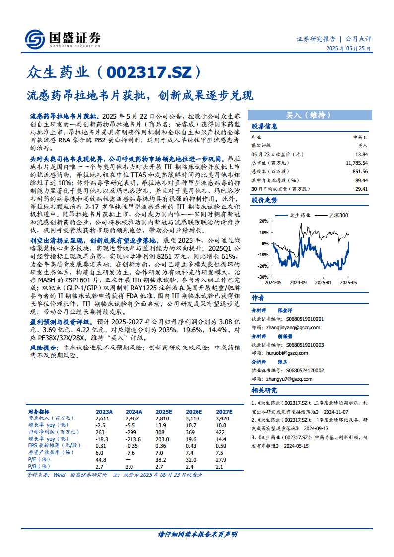 根据预测,众生药业2025-2027年归母净利润分别为3.08亿元、3.69亿元、4.22亿元,对应增速分别为203%、19.6%、14.4%。对应的P/E分别为38X/32X/28X。基于公司创新药的获批和未来管线的潜力,维持“买入”评级。同时,报告提示了临床试验进展不及预期、创新药研发失败以及中成药销售不及预期等风险。