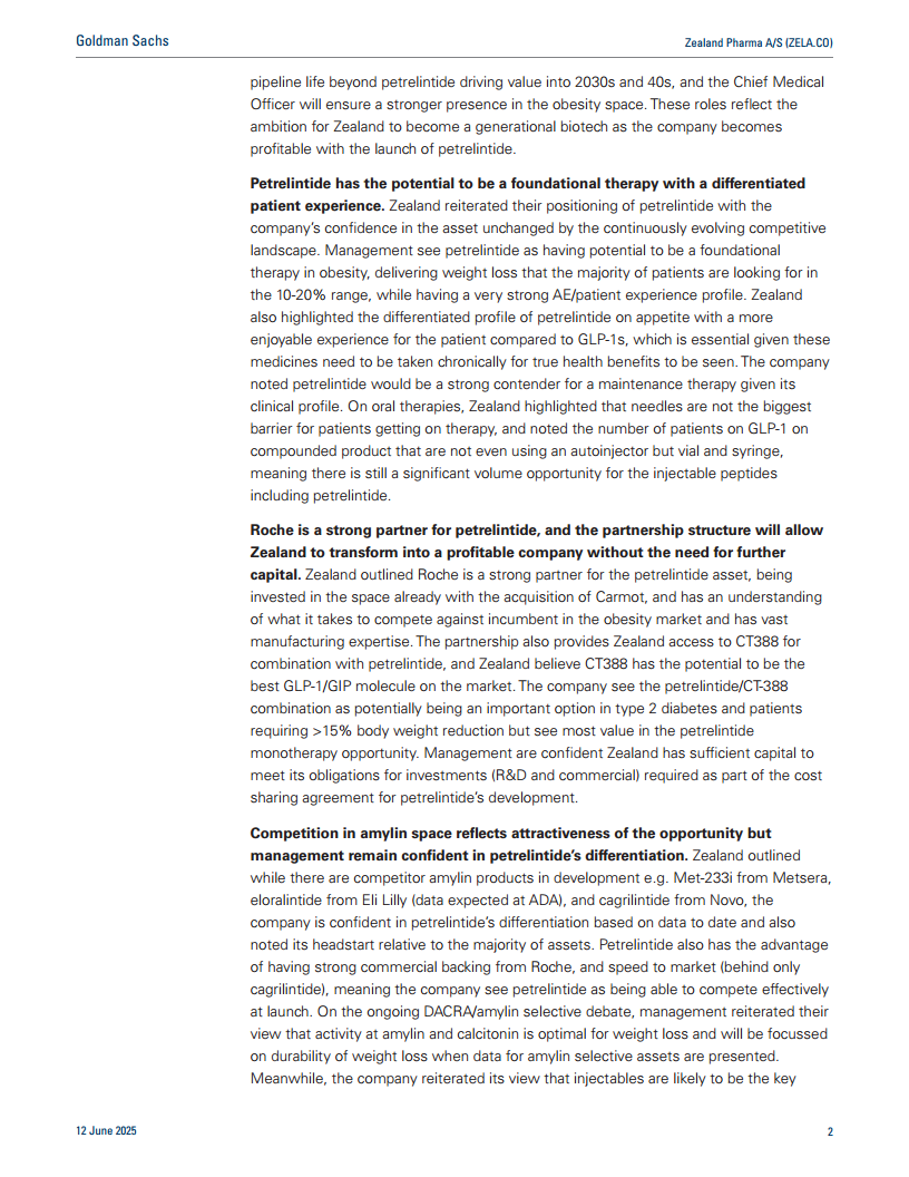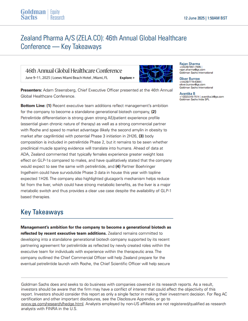 Zealand Pharma正处于其发展历程的关键时期,致力于通过战略性高管团队扩充和核心资产Petrelintide的开发,转型为一家独立的、具有世代影响力的生物科技公司。Petrelintide凭借其在患者体验、减重效果和市场先发方面的强大差异化优势,以及与罗氏的稳固合作,有望在竞争激烈的肥胖治疗市场中脱颖而出,并为公司带来显著的盈利增长。同时,公司在Survodutide和Dapiglutide等其他管线上的进展,以及对身体成分和性别差异的深入研究,进一步巩固了其在代谢疾病领域的创新地位。尽管面临市场竞争和临床失败等风险,高盛仍维持“买入”评级,反映了对Zealand Pharma未来增长潜力的信心。