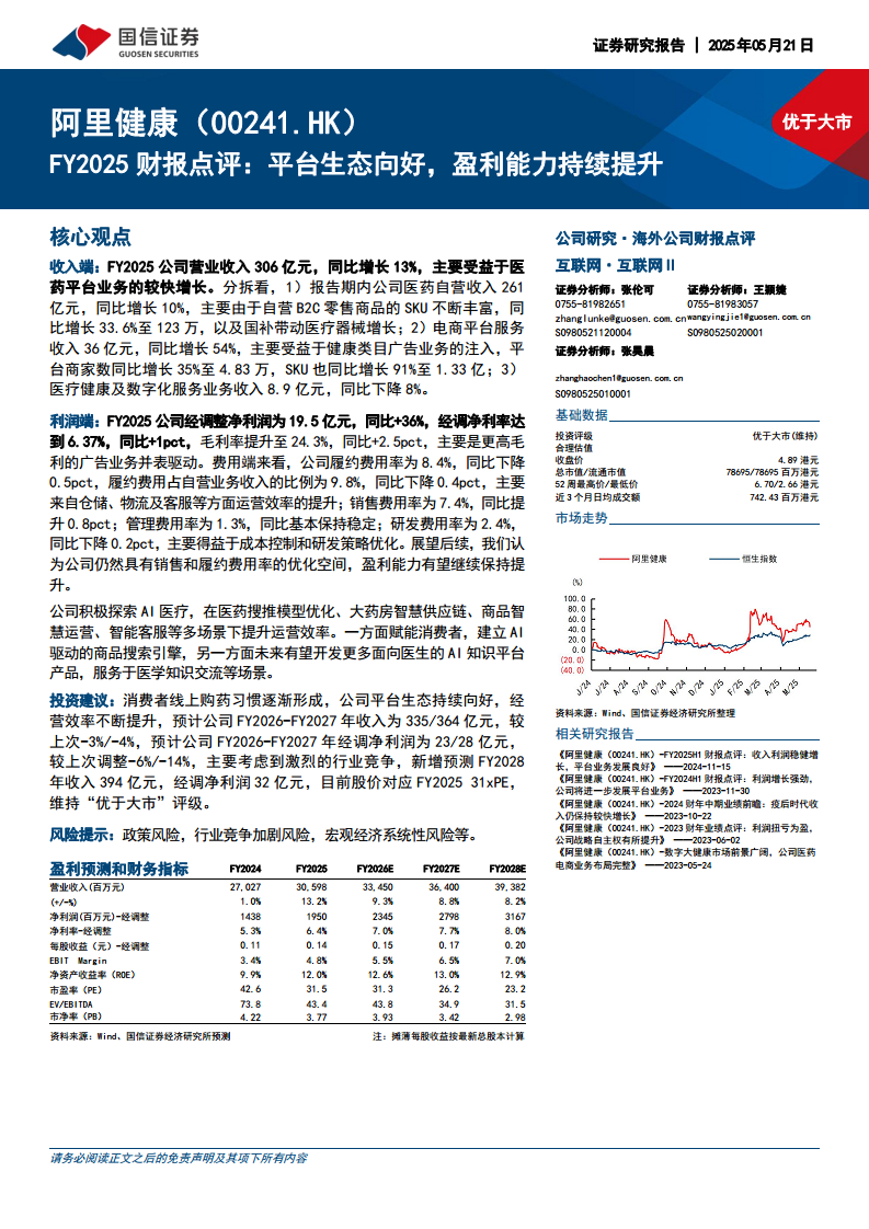 公司积极通过AI技术赋能运营效率,在医药搜推、智慧供应链、商品运营及智能客服等多个场景进行探索和应用,旨在提升消费者体验并拓展面向医生的AI知识平台。鉴于消费者线上购药习惯的日益普及和公司平台生态的持续向好,分析师维持了“优于大市”的投资评级,并预计未来几年收入和利润将继续保持增长态势。