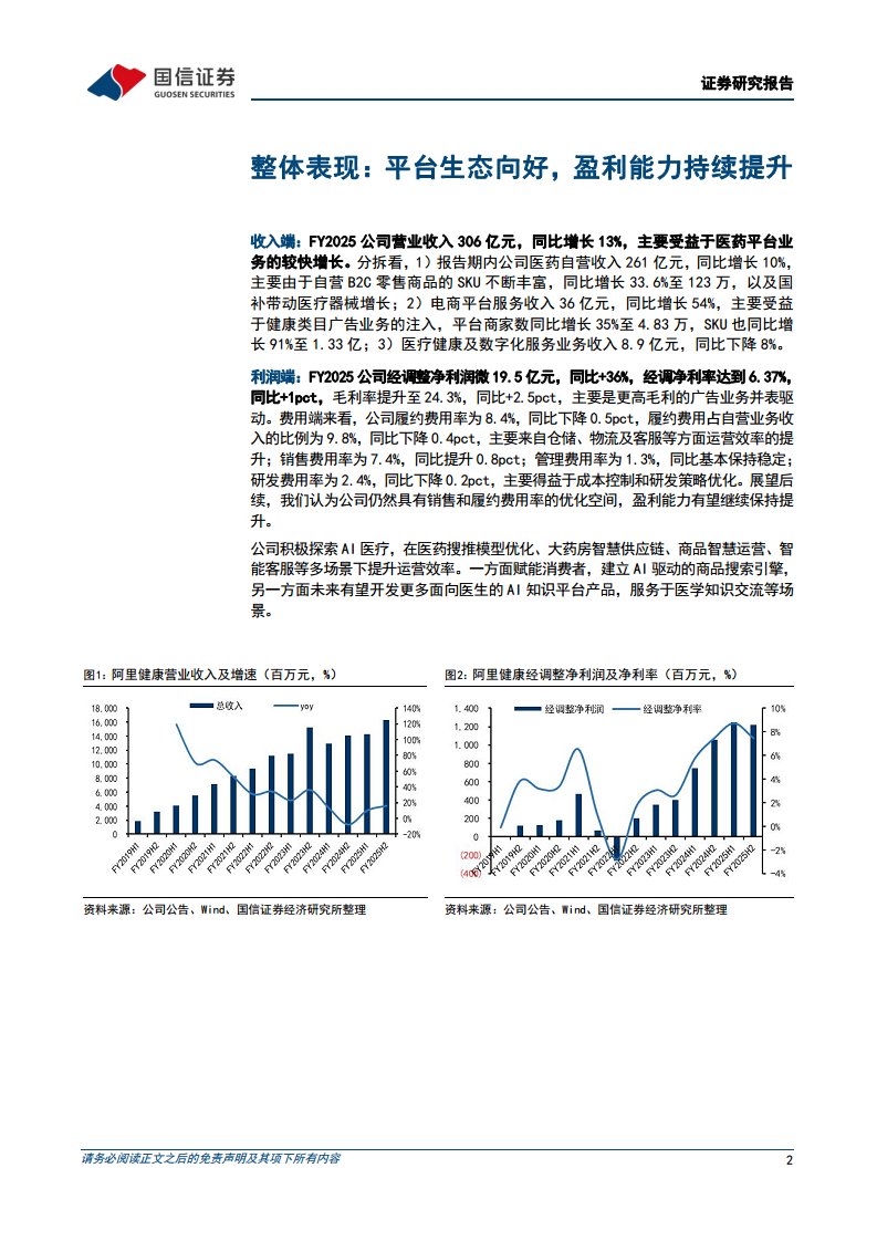 阿里健康在FY2025财年展现出强劲的增长势头,营业收入同比增长13%至306亿元,经调整净利润同比大增36%至19.5亿元。这一优异表现主要得益于医药自营业务的稳健增长和电商平台服务业务的爆发式增长,特别是健康类目广告业务的注入,显著提升了公司的毛利率和整体盈利能力。同时,公司通过优化履约和研发费用率,持续提升运营效率,并积极布局AI医疗,在多个业务场景中探索智能化应用,为未来的可持续发展奠定了基础。尽管面临政策、行业竞争和宏观经济等风险,分析师仍看好其平台生态的持续向好和盈利能力的进一步提升,维持“优于大市”的投资评级。