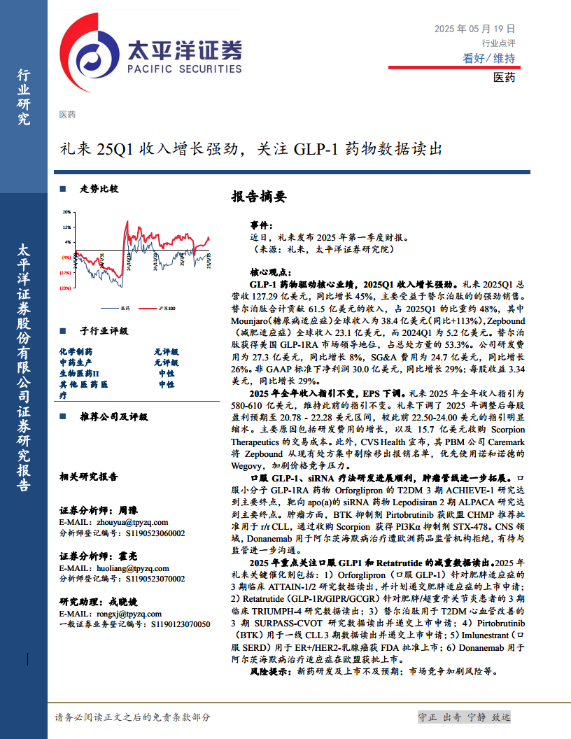 礼来25Q1收入增长强劲,关注GLP-1药物数据读出