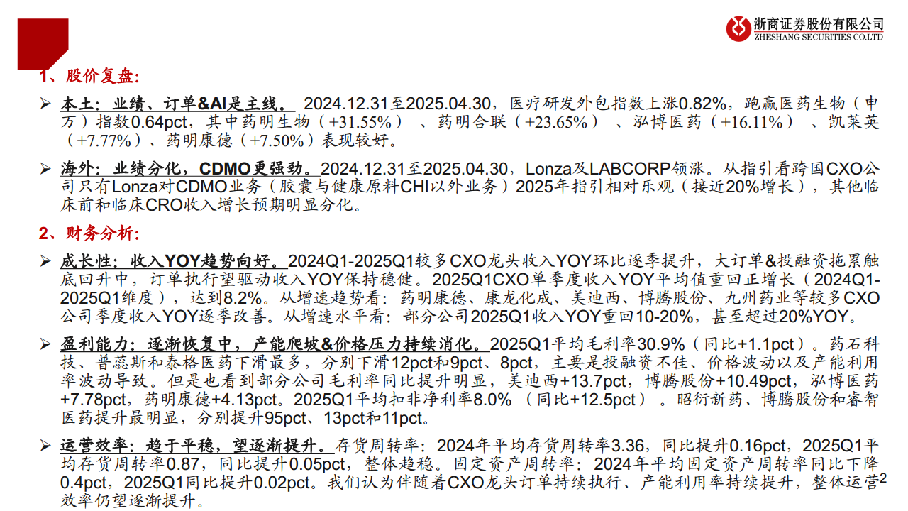 本报告全面分析了CXO行业2024年及2025年第一季度的业绩表现,明确指出行业基本面已出现积极拐点。从股价复盘来看,本土医疗研发外包指数跑赢大盘,药明生物、药明合联等龙头表现突出;海外市场中,Lonza的CDMO业务指引强劲,显示出细分领域的增长潜力。财务数据显示,CXO龙头企业收入YOY逐季改善,2025Q1平均收入YOY重回正增长8.2%,盈利能力也逐步恢复,平均毛利率和扣非净利率均有提升。运营效率趋于平稳,并有望随着订单执行和产能利用率提升而进一步改善。