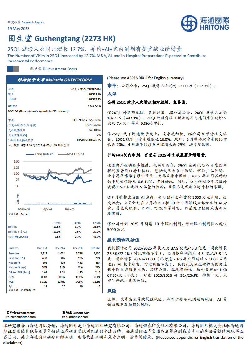固生堂在2025年第一季度实现了12.7%的就诊人次同比增长,尽管受到2024年高基数的影响,但线下门诊量呈现出逐季度加速回暖的积极趋势。公司正积极通过国内外并购、推出AI名医分身以及拓展院内制剂等多元化战略,为未来的业绩增长注入新动能。分析师维持对固生堂“优于大市”的评级,并预计其2025/2026年收入和净利润将保持稳健增长,看好其作为中医医疗服务龙头的长期发展潜力。然而,投资者仍需关注医保政策、海外扩张进展以及AI技术应用效果等潜在风险。