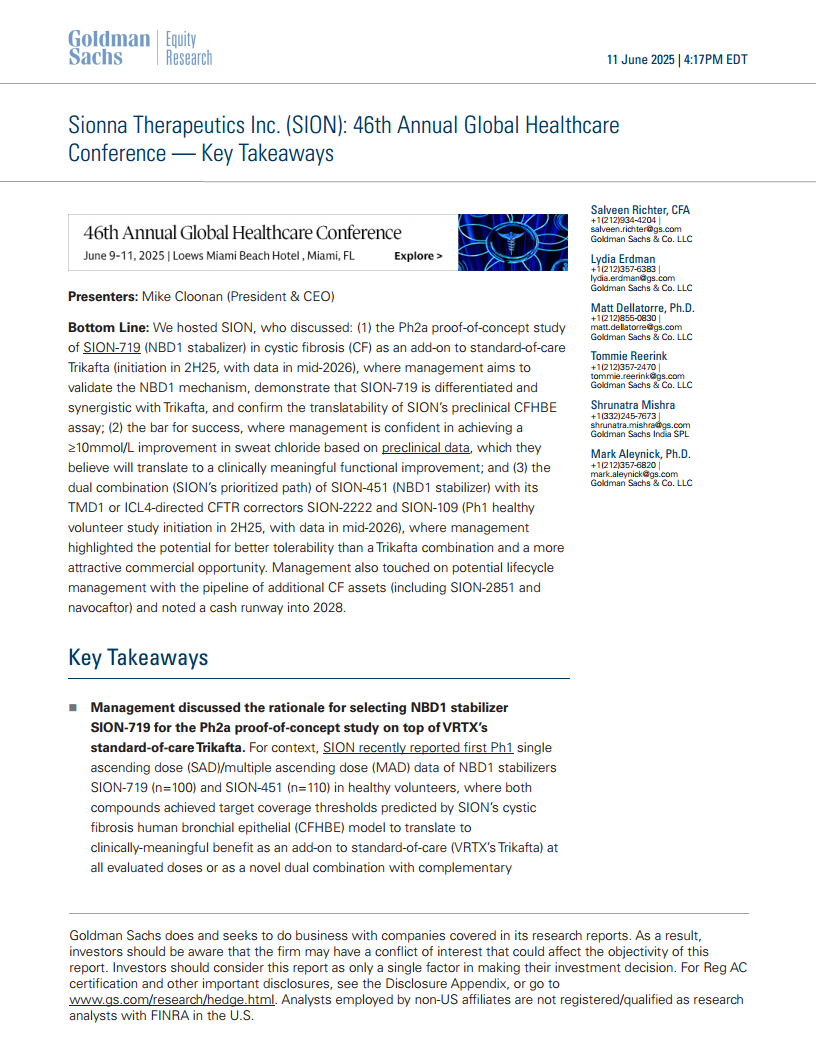 Sionna Therapeutics (SION) 正通过其NBD1稳定剂SION-719和SION-451,积极推进囊性纤维化 (CF) 治疗的临床开发。SION-719作为Trikafta的附加疗法,其Ph2a概念验证研究预计于2025年下半年启动,并以汗液氯化物改善10mmol/L为成功标准,该标准得到了临床前数据和KOL反馈的支持。同时,公司优先发展SION-451与CFTR校正剂SION-2222/SION-109的双重组合疗法,旨在提供更优的耐受性和商业机会,相关Ph1研究也计划于2025年下半年启动。尽管公司目前处于早期生物技术阶段,尚未产生收入,且EBITDA和EPS预计持续为负,但管理层表示现金流可支持至2028年,为未来的临床进展和市场拓展提供了基础。