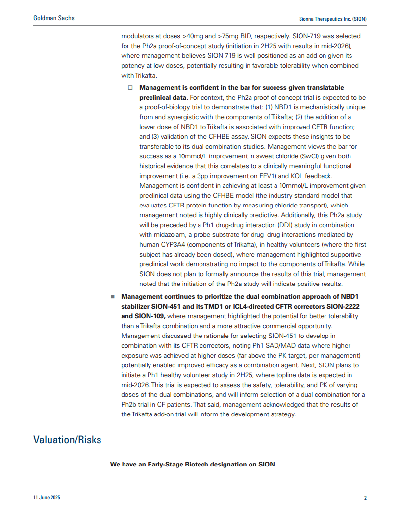 管理层继续优先推进NBD1稳定剂SION-451与其TMD1或ICL4靶向CFTR校正剂SION-2222和SION-109的双重组合疗法。管理层强调,这种组合疗法可能比与Trikafta的组合具有更好的耐受性,并带来更具吸引力的商业机会。选择SION-451进行组合开发的原因在于其Ph1 SAD/MAD数据,该数据显示在更高剂量下实现了更高的暴露量(远高于PK目标),这可能增强其作为组合药物的疗效。SION计划于2025年下半年启动一项Ph1健康志愿者研究,预计在2026年中期获得初步数据。该试验将评估不同剂量双重组合疗法的安全性、耐受性和药代动力学 (PK),并将为CF患者的Ph2b试验选择最佳双重组合方案提供依据。管理层也承认,Trikafta附加疗法的结果将为双重组合疗法的开发策略提供信息。