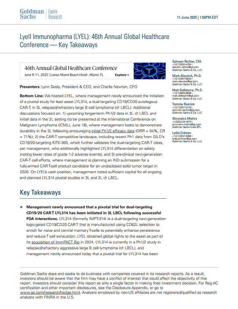 本报告详细分析了Lyell Immunopharma (LYEL) 在第46届全球医疗保健大会上的关键进展和未来展望。核心亮点在于其主导资产LYL314在3L r/r LBCL中关键性研究的启动,以及2L LBCL研究的稳步推进。LYL314作为一种双靶点CAR-T疗法,在初步临床数据中展现出高客观缓解率和完全缓解率,公司管理层致力于在即将到来的ICML会议上展示其持久缓解数据,并强调其在安全性方面的差异化优势。此外,公司拥有充足的资金支持LYL314的临床开发,并积极布局下一代实体瘤CAR-T疗法。尽管面临早期生物技术公司的固有风险,但LYEL通过聚焦核心资产开发和审慎的财务管理,展现了其在细胞疗法市场中的增长潜力和战略布局。