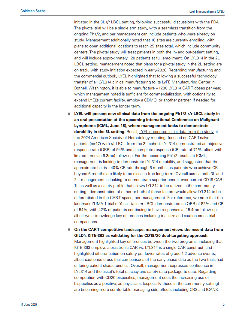 Lyell Immunopharma将在即将举行的国际恶性淋巴瘤大会(ICML,6月18日)上以口头报告形式公布正在进行的Ph1/2 r/r LBCL研究的最新临床数据,重点在于展示LYL314在3L环境下的持久缓解率。此前在2024年美国血液学会(ASH)会议上公布的初步数据显示,在17名初次接受CAR-T治疗的3L r/r LBCL患者中,LYL314的客观缓解率(ORR)达到94%,完全缓解率(CR)达到71%,尽管中位随访时间有限(6.3个月)。管理层表示,ICML会议上将展示的持久性数据,其目标是达到约40%的6个月完全缓解率,因为超过6个月仍保持完全缓解的患者很可能实现长期无病生存。总体而言,公司旨在证明LYL314在3L和2L LBCL中相对于现有CD19 CAR-T疗法具有更优的疗效,并具备可在社区环境中使用的安全性特征,以实现其在CAR-T领域的差异化。作为参考,Yescarta在ZUMA-1试验中对r/r LBCL患者的ORR为82%,CR为54%,15.4个月随访时仍有42%的患者持续缓解,但需谨慎进行跨试验比较。