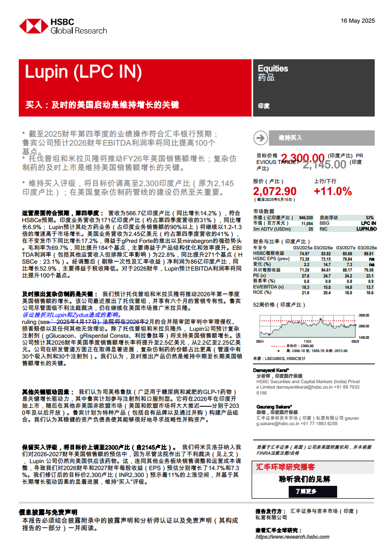 本报告分析了Lupin在2025财年第四季度的强劲业绩表现,强调了其在营收、毛利率和EBITDA利润率方面的显著增长。报告指出,美国市场复杂仿制药的及时推出,特别是托伐普坦和米拉贝隆,是公司未来增长的关键驱动力。Lupin在印度市场的稳健表现以及对GLP-1等新兴机遇的布局,也为其全球扩张提供了动力。鉴于公司在研发管线建设和盈利能力提升方面的进展,汇丰银行维持“买入”评级,并上调目标价至2,300印度卢比,反映了对Lupin长期增长潜力的信心。