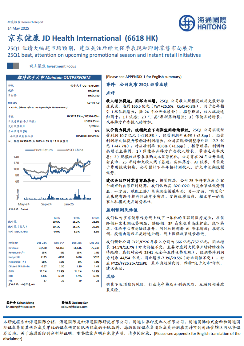 京东健康在2025年第一季度取得了超出市场预期的优异业绩,收入和经营利润均实现大幅增长,尤其在保健品销售和规模效应驱动下,利润率显著提升。公司正积极布局即时零售,计划在10个城市发力自营即时送药服务,并通过B2C+O2O复合策略,赋能上游厂商并提升用户粘性。同时,公司持续加大对线下基建、实体药房和AI技术的投入,以巩固其作为线上线下一体化互联网医疗龙头的地位。尽管存在销售不及预期、行业竞争加剧和政策风险,但鉴于其在供需两端的显著优势和稳健的财务表现,海通国际维持对京东健康“优于大市”的评级,并建议投资者关注其后续大促季表现和即时零售布局的展开。