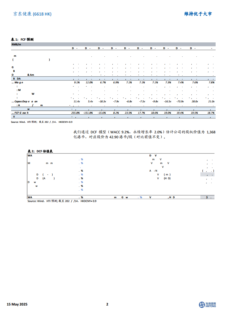 报告预计公司FY25/FY26年收入分别为666亿元/757亿元人民币,同比分别增长14.5%/13.7%。尽管大促季业绩持续性仍待跟踪,但报告对公司25H1及全年业绩保持乐观。经调整净利润预计分别为44亿元/54亿元人民币,同比分别增长-7.3%/20.5%。这对应FY25/FY26的市盈率(P/E)分别为26倍和21倍。 通过DCF模型(WACC 9.2%,永续增长率2.0%)估算,公司的股权价值为1368亿港币,对应目标股价为42.90港币/股,与前值保持不变。