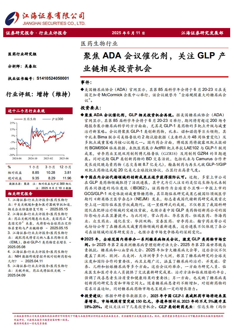 医药生物行业:聚焦ADA会议催化剂,关注GLP产业链相关投资机会