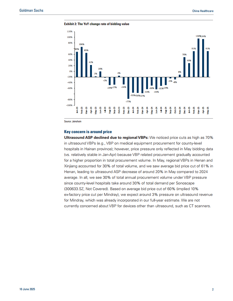 在5月份,河南和新疆的区域VBP采购量占总量的30%。其中,河南省的平均中标价格下降了61%,导致5月份超声设备的平均销售价格(ASP)较2024年平均水平下降了约20%。