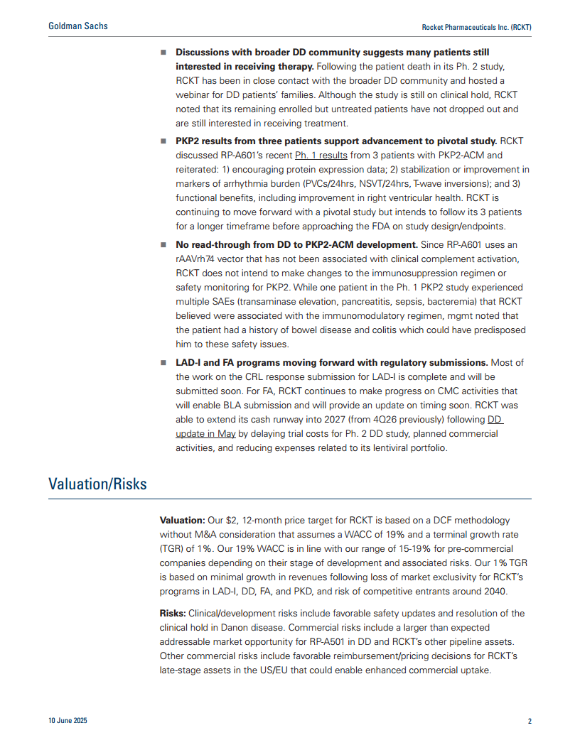 RCKT的LAD-I和FA项目监管提交工作进展顺利,有望在年底前完成。公司已成功将现金流延长至2027年,并通过优先投资AAV管线和计划出售潜在的优先审查凭证(PRVs)来进一步优化财务状况。然而,高盛基于其估值模型和风险分析,对RCKT给出了“卖出”评级,12个月目标价为2美元,表明存在显著下行风险。