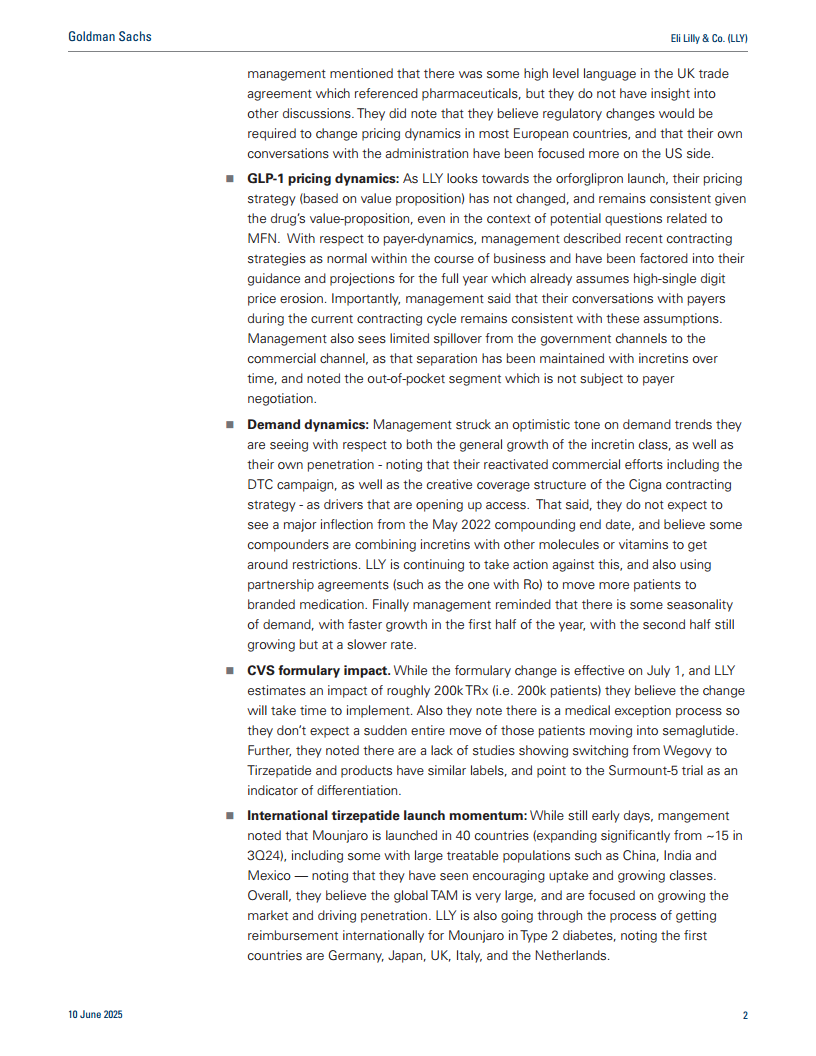 礼来公司与美国政府就药物定价和最惠国待遇(MFN)议题进行了建设性对话,管理层将这些对话描述为积极的,并专注于教育政府其为改善消费者自付费用所做的努力,包括通过LillyDirect平台。管理层表示,目前尚不清楚政府在MFN问题上的具体立场,且预测其明朗化的时间很困难,但似乎并非迫在眉睫。在与欧洲国家的谈判中,礼来管理层指出,英国贸易协议中提及了药品,但他们认为在大多数欧洲国家,改变定价动态需要监管变革,且公司与美国政府的对话主要集中在美国市场。