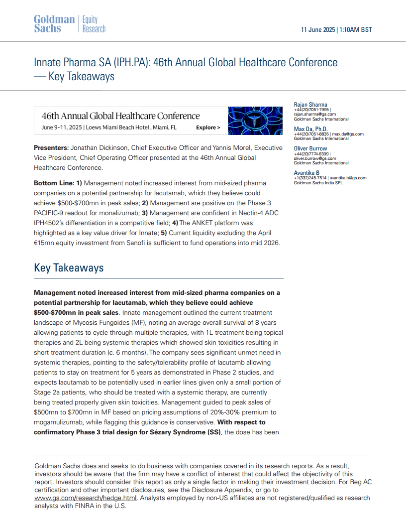 先天制药公司(IPH):Innate Pharma SA (IPH.PA):第46届全球医疗保健年度会议——要点