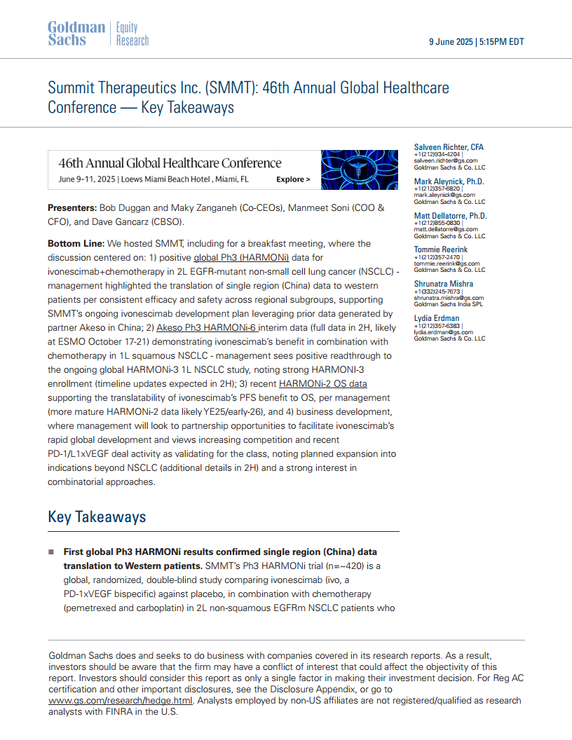 本报告核心观点指出,Summit Therapeutics (SMMT) 的双特异性抗体伊沃西单抗(ivonescimab)在非小细胞肺癌(NSCLC)治疗领域展现出显著的全球临床突破和市场潜力。其在2L EGFR突变NSCLC的全球Ph3 HARMONi研究中取得了积极的无进展生存期(PFS)数据,并初步显示出总生存期(OS)的积极趋势,成功验证了中国地区数据的全球可转化性。此外,在1L鳞状NSCLC的HARMONi-6研究中,ivonescimab联合化疗方案也达到了PFS主要终点,进一步巩固了其作为一线治疗选择的潜力。Akeso HARMONi-2研究的OS数据亦支持ivonescimab的PFS益处可转化为OS,为SMMT正在进行的全球1L NSCLC研究(HARMONi-3和HARMONi-7)提供了坚实基础。
