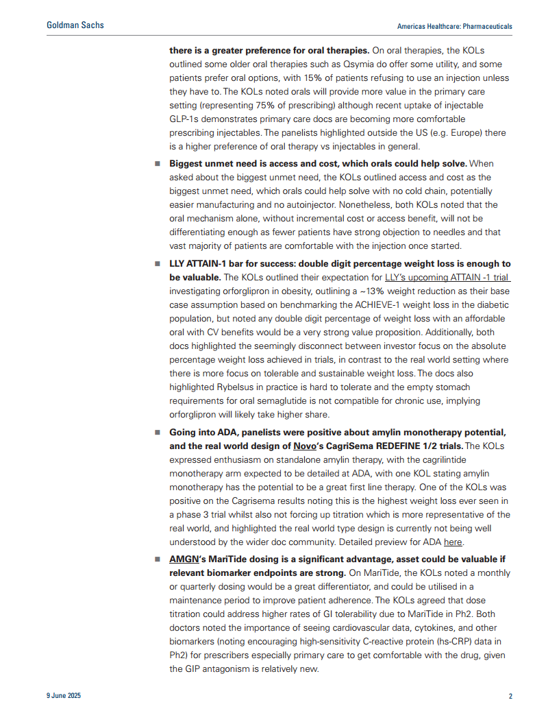 关于MariTide,KOLs指出每月或每季度给药将是一个重要的差异化优势,可用于维持期以提高患者依从性。KOLs同意,剂量滴定可以解决二期试验中MariTide引起的较高胃肠道耐受性问题。两位医生都强调,对于处方医生,特别是基层医生而言,心血管数据、细胞因子和其他生物标志物(二期中高敏C反应蛋白(hs-CRP)数据令人鼓舞)的重要性,以使其对该药物感到放心,鉴于GIP拮抗作用相对较新。