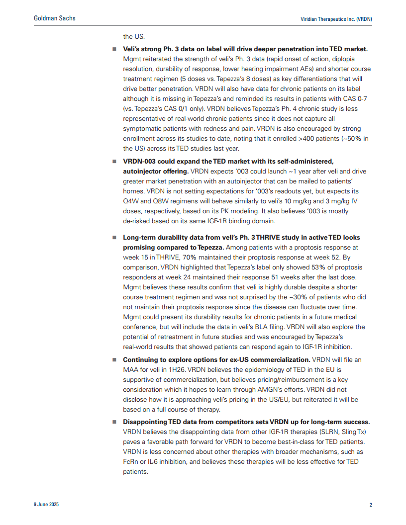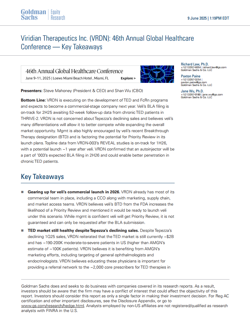 VRDN正积极推进其TED和FcRn项目,并有望在2026年成为一家商业化公司。Veli凭借其卓越的三期临床数据、突破性疗法认定以及差异化的治疗方案,有望在TED市场占据重要地位。同时,VRDN-003的自注射方案预计将进一步扩大市场渗透。尽管面临市场竞争和潜在风险,VRDN对自身产品的疗效和市场潜力充满信心,并已为全球商业化做好准备。高盛给予VRDN“买入”评级,目标价27美元,反映了对其未来增长的乐观预期。