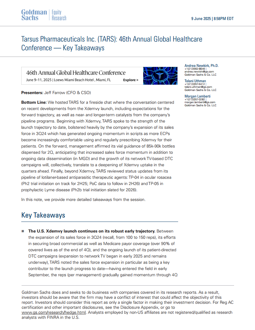 Tarsus Pharmaceuticals Inc. (TARS) 在第46届全球医疗健康大会上强调,其核心产品Xdemvy在美国市场的推出势头强劲,销售团队扩张、广泛的支付方覆盖以及DTC(直接面向消费者)营销活动共同推动了处方量的增长。公司正积极深化Xdemvy在共病患者群体中的渗透,并对未来的销量增长持乐观态度。