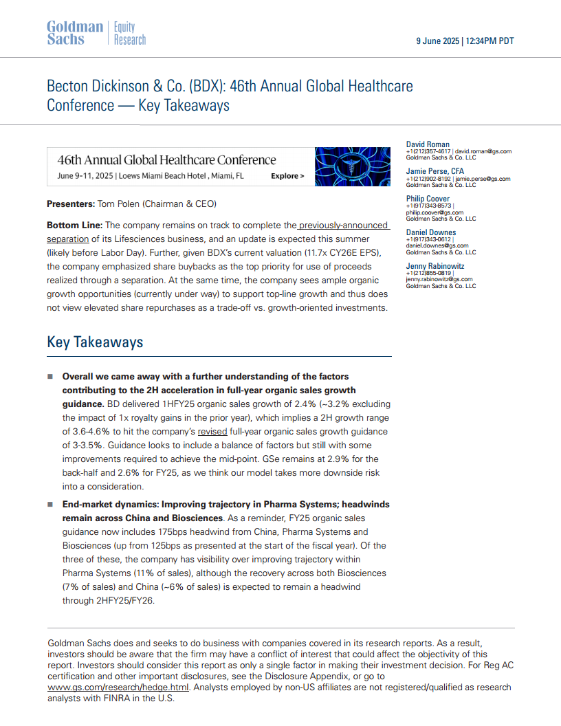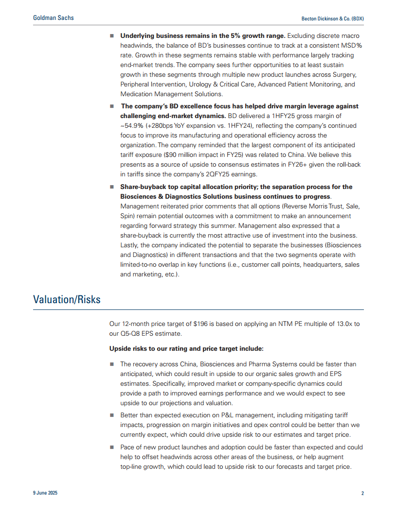 BD在2025财年上半年实现了2.4%的有机销售增长(剔除去年一次性特许权使用费收益影响约为3.2%)。为达到公司修订后的全年3-3.5%有机销售增长指引,下半年需实现3.6-4.6%的增长。高盛预计下半年增长率为2.9%,全年为2.6%,其模型考虑了更多的下行风险。