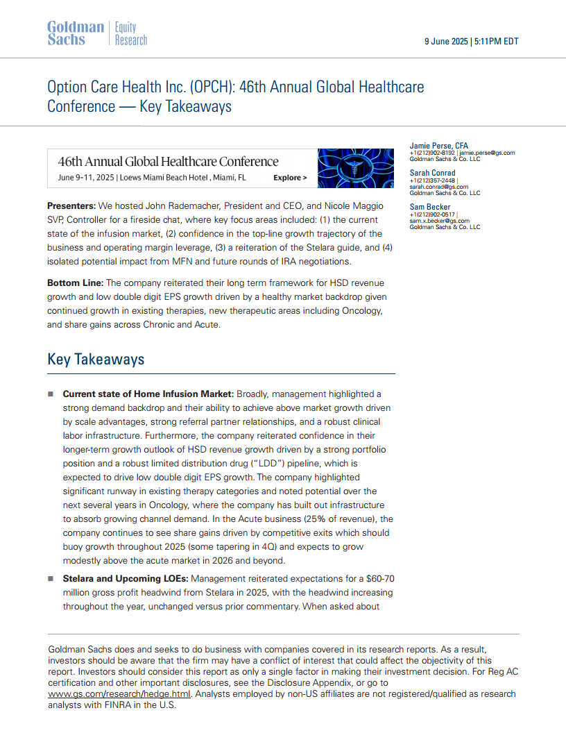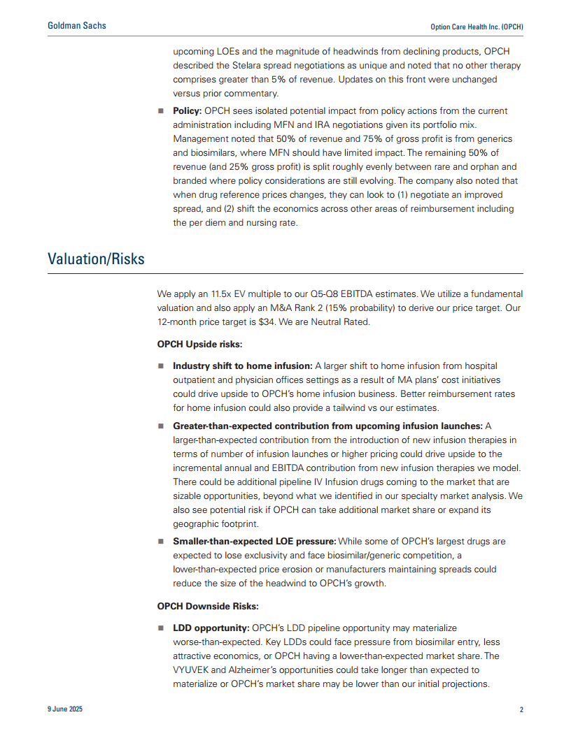 OPCH在强劲的家庭输液市场需求和自身战略优势的推动下,展现出稳健的营收和盈利增长潜力。公司通过多元化的产品组合,特别是仿制药和生物类似药的高占比,有效降低了Stelara独占期到期和潜在政策变化(如MFN和IRA谈判)带来的风险。尽管面临商业支付方集中度高和LDD机会实现不及预期的下行风险,但行业向家庭输液的结构性转变以及新疗法的持续推出为OPCH提供了显著的上行空间。高盛维持对OPCH的“中性”评级,目标价为34美元,财务预测显示公司未来几年将保持持续增长态势。