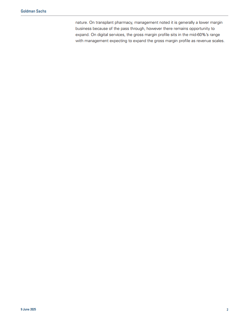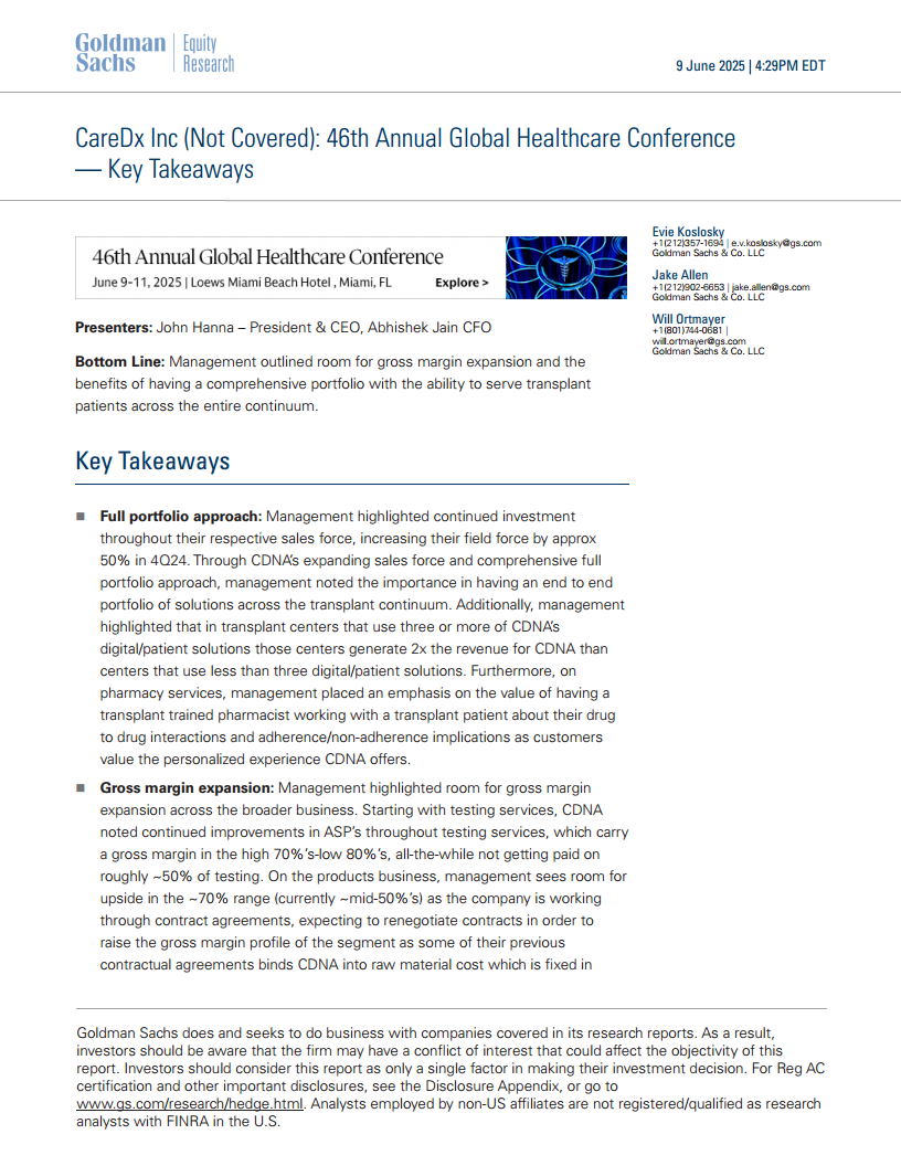 本报告总结了CareDx Inc.在第46届全球医疗保健大会上的关键信息,核心在于公司通过“全面产品组合”和“毛利率扩张”两大战略,旨在实现持续增长和盈利能力提升。在市场扩张方面,CareDx通过将销售团队规模扩大约50%来增强市场渗透,并利用其端到端解决方案的优势,尤其是在使用多项数字/患者解决方案的移植中心,实现了两倍的收入增长。此外,个性化移植药学服务也因其为客户带来的独特价值而受到重视。在盈利能力提升方面,公司计划通过优化检测服务的平均销售价格、重新谈判产品业务合同以摆脱固定原材料成本约束、以及利用数字服务规模效应来提高毛利率。尽管移植药房业务毛利率较低,但仍存在扩张机会。高盛的披露附录也透明地展示了其与CareDx Inc.的业务关系,并阐述了其研究方法和评级体系,为投资者提供了全面的分析背景。