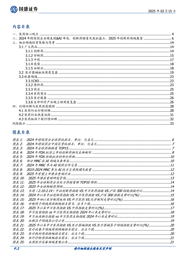 本报告核心观点指出,在2025年2月10日至2月14日当周,医药生物板块表现强劲,申万医药指数环比上涨2.71%,跑赢创业板和沪深300指数。这一增长主要由AI应用,特别是AI医疗概念的爆发性演绎所驱动,基因数据价值逻辑分支表现尤为突出。市场对中国资产的重估逻辑,以及港股创新药的国际竞争力提升,也为医药板块带来了结构性投资机会。