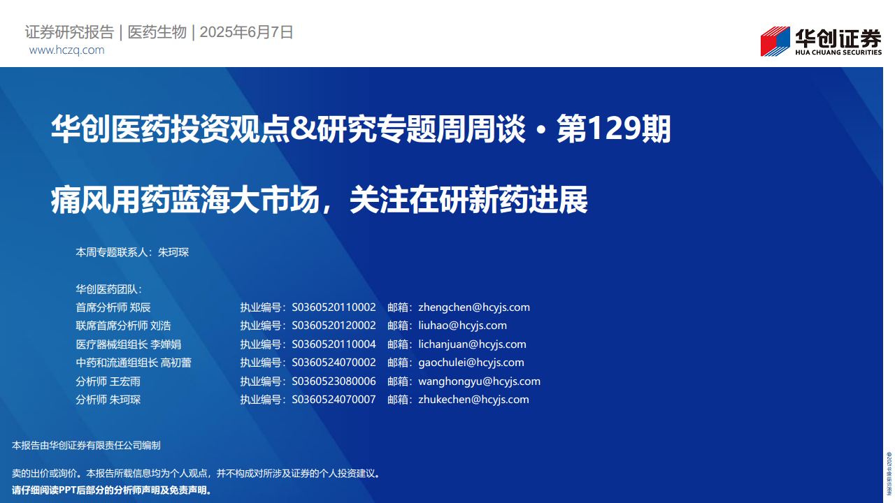 华创医药投资观点、研究专题周周谈第129期:痛风用药蓝海大市场,关注在研新药进展