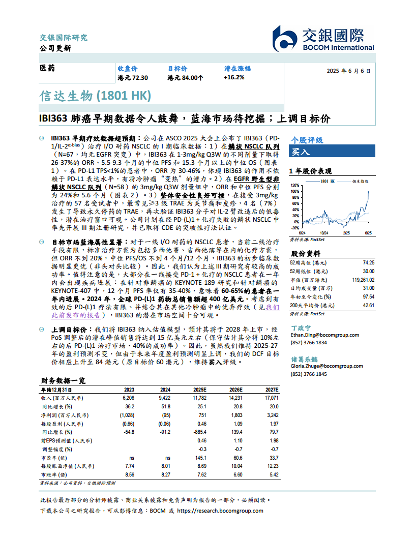 鉴于IBI363在巨大蓝海市场中的显著潜力,交银国际上调了信达生物的目标价至84港元,并维持“买入”评级,反映了市场对其未来盈利能力和增长前景的积极预期。