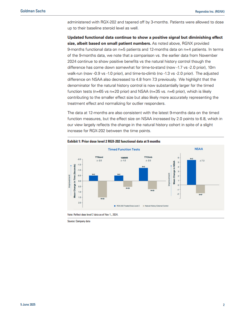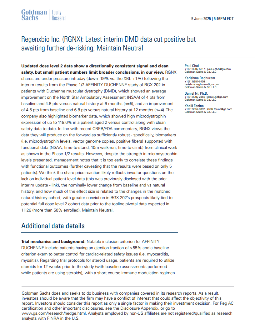 本报告对Regenxbio (RGNX) 治疗杜氏肌营养不良症(DMD)的基因疗法RGX-202的最新临床数据进行了专业且分析性的评估。数据显示,RGX-202在功能性改善(NSAA评分提升)和微肌营养不良蛋白表达方面表现积极,且安全性良好,无严重不良事件报告,这在竞争激烈的DMD基因疗法市场中具有潜在优势。然而,由于目前患者样本量较小,且效应量有所下降,投资者仍需谨慎对待。高盛维持对RGNX的“中性”评级,目标价13美元,并强调了未来关键性研究数据(预计2026年上半年公布)以及商业化执行能力对公司估值和市场表现的关键影响。公司在监管计划和商业化准备方面已有所行动,并预计新生儿筛查的增加将扩大其潜在市场。
