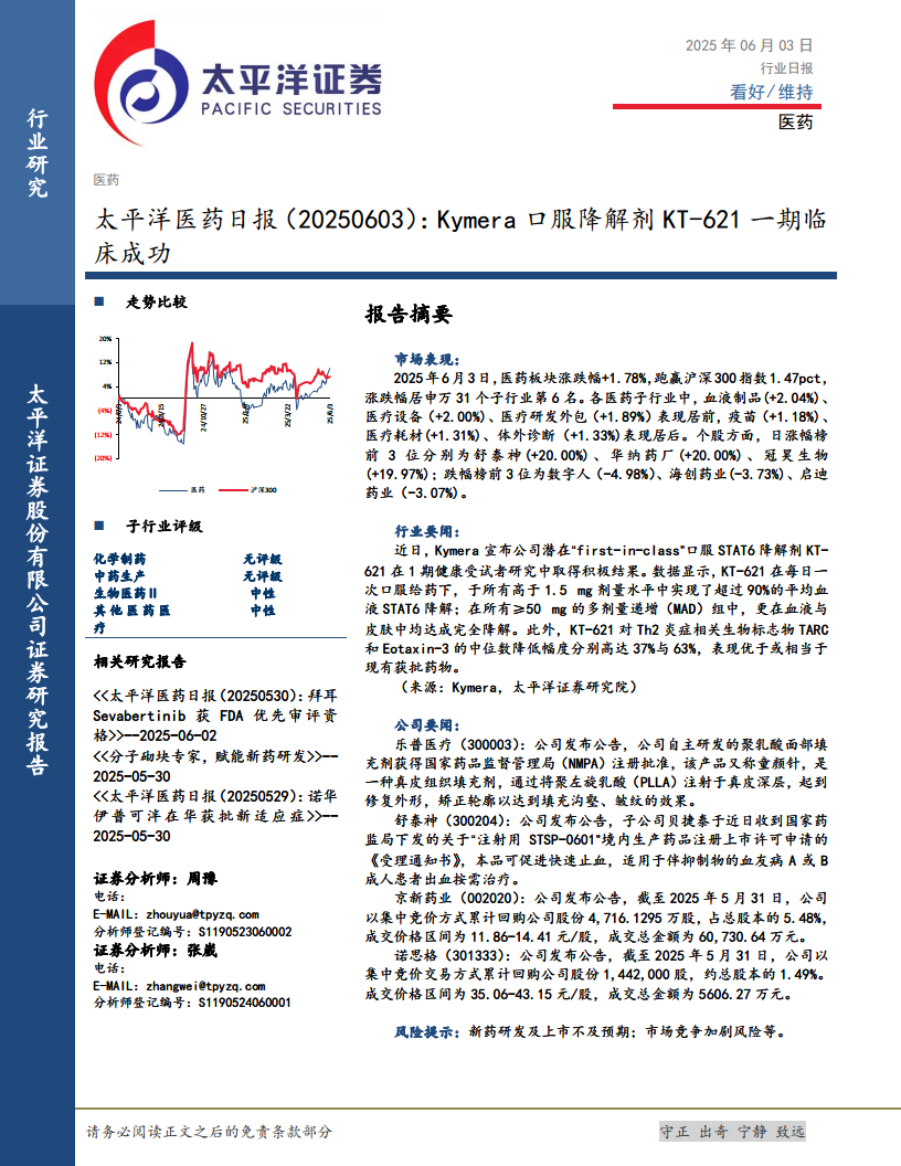 2025年6月3日,医药板块整体表现强劲,跑赢沪深300指数,位列申万31个子行业前茅。同时,Kymera公司在口服STAT6降解剂KT-621的一期临床试验中取得了积极成果,展示了创新药物在治疗Th2炎症相关疾病方面的巨大潜力,预示着医药研发领域的持续进步。