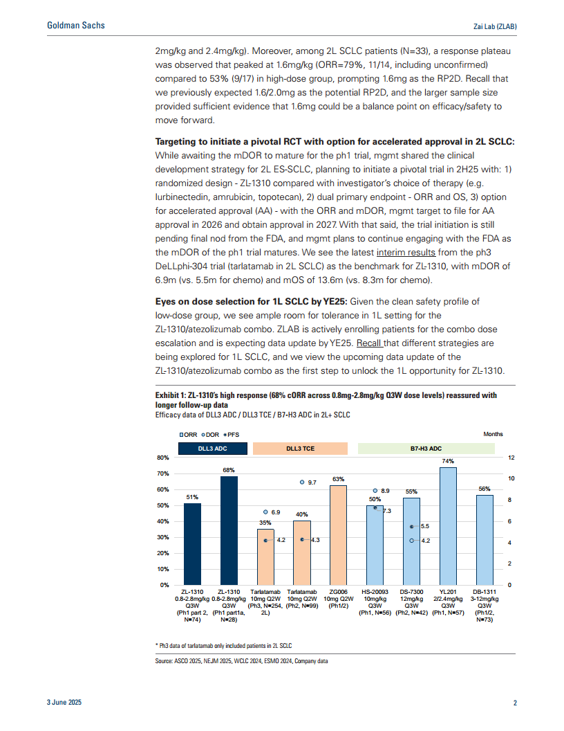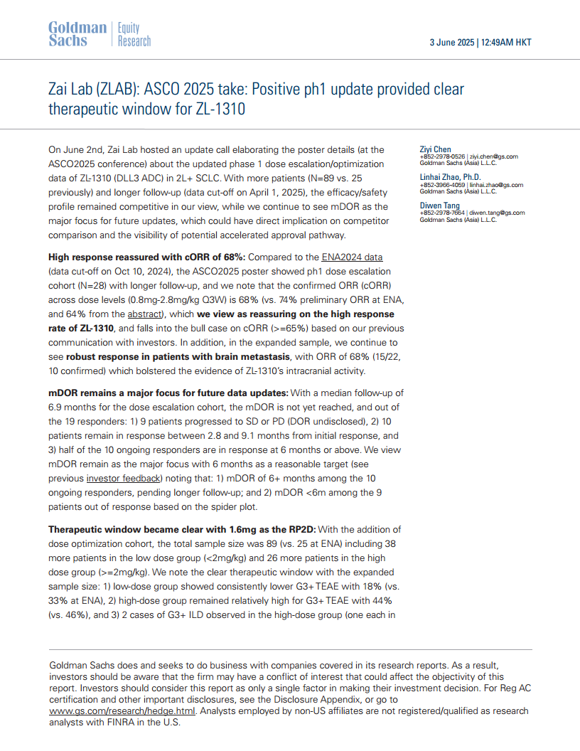 再鼎医药在ASCO 2025会议上公布的ZL-1310(DLL3 ADC)I期临床更新数据积极,在2L+ SCLC患者中展现出68%的确认客观缓解率和对脑转移的良好疗效。通过扩大样本量,1.6mg/kg被明确为推荐的II期剂量,实现了疗效与安全性的最佳平衡。公司计划在2025年下半年启动一项关键性随机对照试验,并寻求在2026年提交加速审批申请,目标在2027年获得批准。此外,ZL-1310与阿替利珠单抗的联合疗法在1L SCLC中的潜力也备受关注,预计2025年底将有数据更新。再鼎医药正积极向全球化、内部研发驱动的生物科技公司转型,其中国市场业务提供坚实基础,而全球管线资产(如ZL-1310)则有望带来显著的价值增长,高盛维持“买入”评级,并提示了相关风险。
