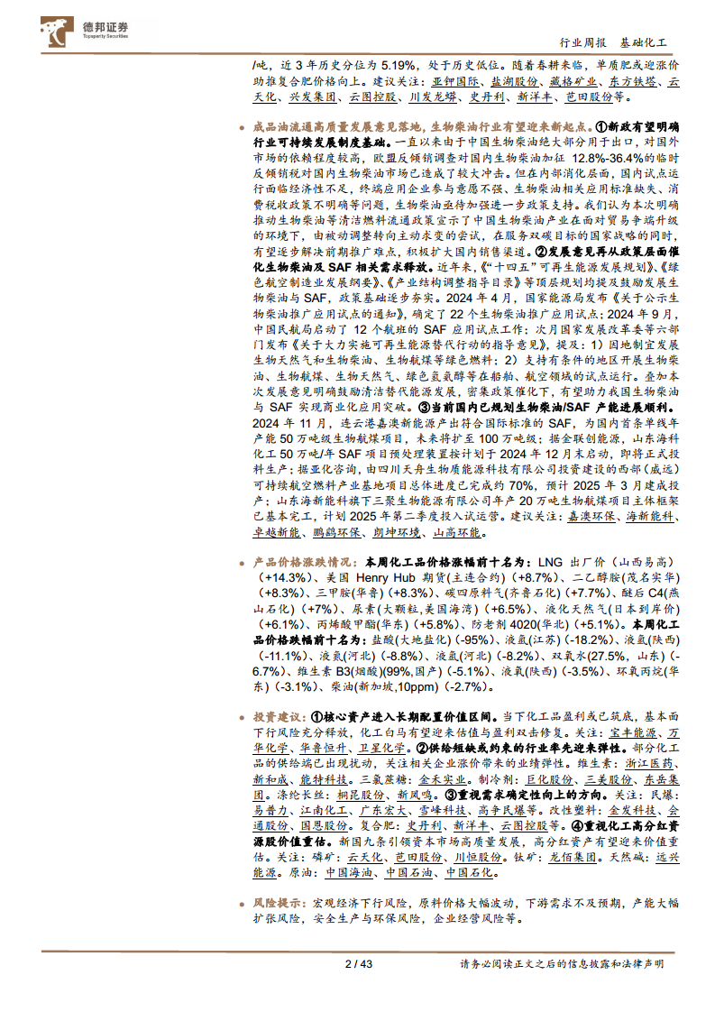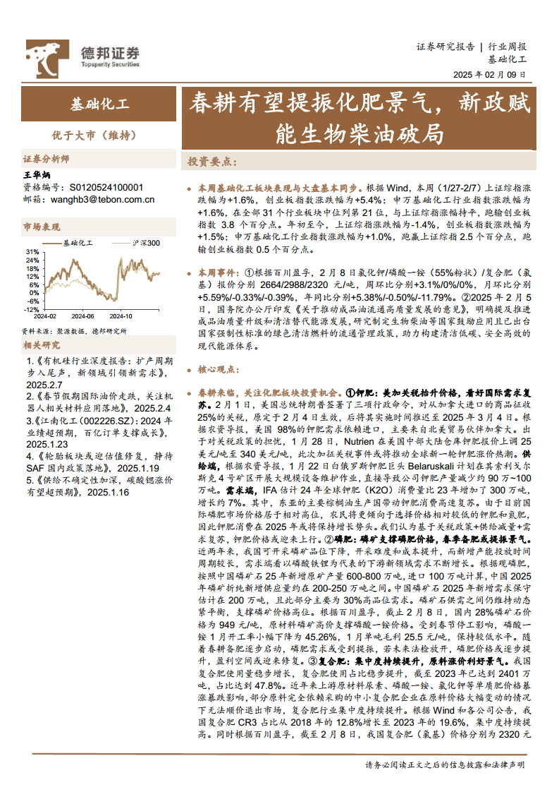 本周基础化工板块表现与大盘基本同步,细分板块涨跌互现。市场焦点集中于春耕备肥对化肥景气的提振作用,以及国务院新政对生物柴油行业发展的赋能。钾肥、磷肥和复合肥在关税政策、供给减量、需求复苏及行业集中度提升等多重因素影响下,价格有望迎来上行。生物柴油行业在国家政策明确支持和多项顶层规划的催化下,有望解决推广难题,扩大国内销售渠道,并实现商业化应用突破,当前国内SAF产能项目进展顺利。同时,报告建议关注化工核心资产、供给短缺或受约束行业、需求确定性向上方向以及高分红资源股的投资机会。整体而言,化工行业在政策发力、供给侧改革和全球市场份额抢占的背景下,有望进入新一轮长景气周期,但仍需警惕宏观经济下行、原料价格波动及产能扩张等风险。