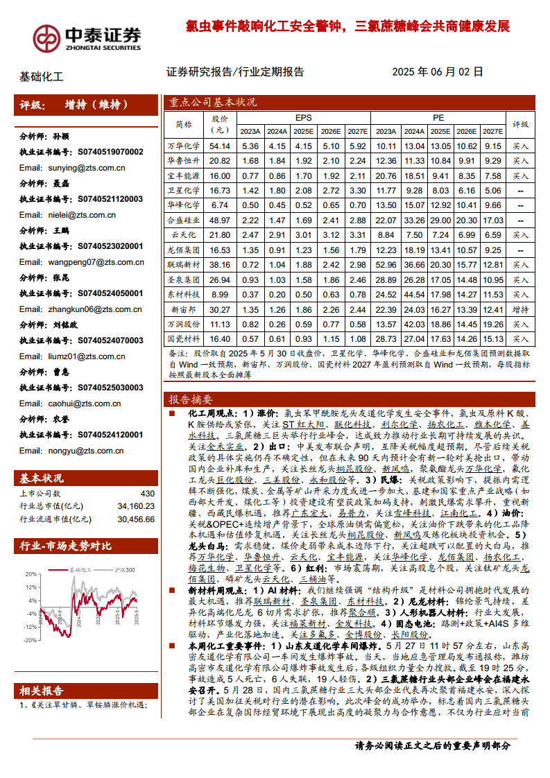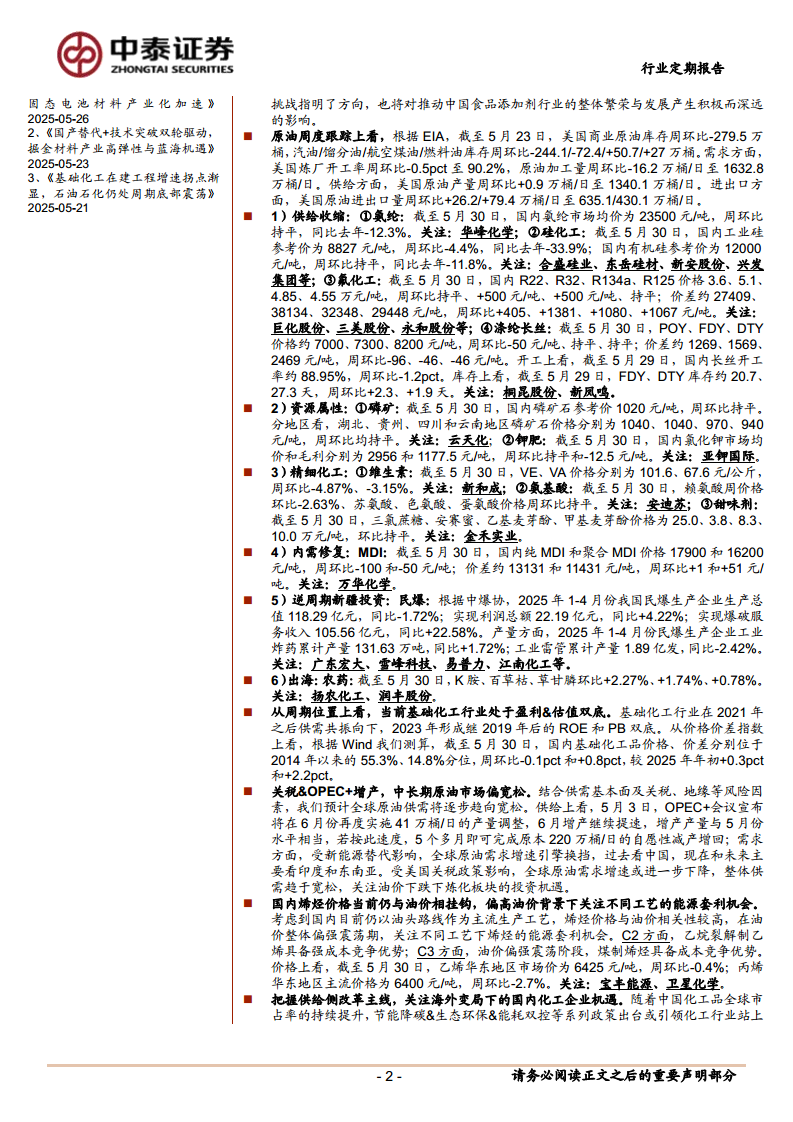 本报告核心观点指出,当前基础化工行业正处于盈利与估值双底的周期位置,面临多重结构性机遇与挑战。一方面,氯虫苯甲酰胺安全事件和三氯蔗糖行业峰会凸显了化工安全与可持续发展的重要性,并对相关产品供给和价格产生直接影响。另一方面,中美关税政策调整、OPEC+增产等宏观因素共同塑造了原油市场偏宽松的预期,为化工品成本带来下行空间。