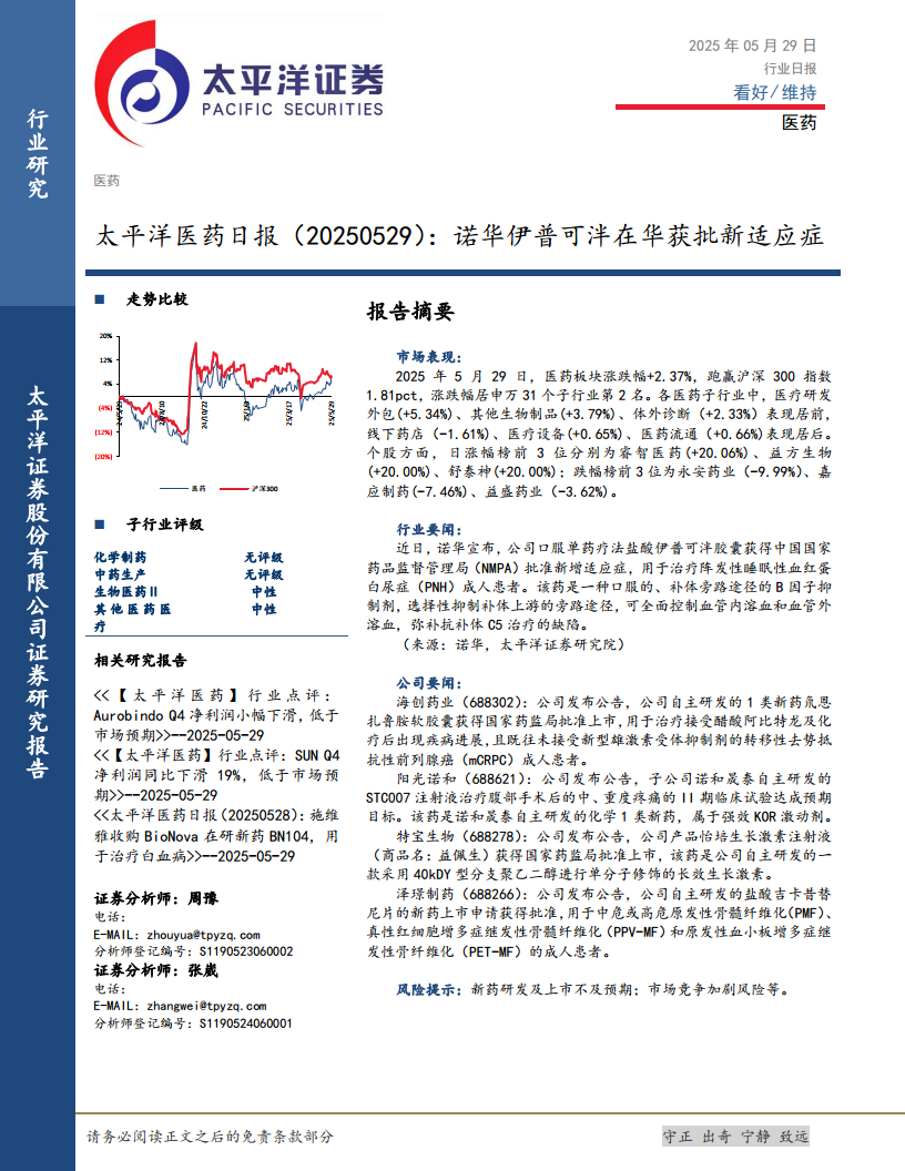 本报告期内,国际制药巨头诺华的口服单药疗法伊普可泮在中国获批新适应症,进一步完善了PNH治疗方案。同时,国内多家创新药企如海创药业、阳光诺和、特宝生物和泽璟制药也相继公布了其自主研发新药的上市批准或临床试验积极进展,这些成果共同彰显了中国医药行业在创新能力和市场转化方面的活力。