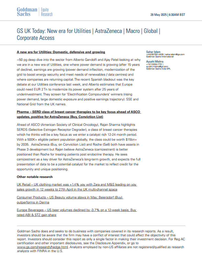 高盛英国今日:公用事业新时代 阿斯利康 宏观 全球 企业对接:公用事业新时代:本土、防御性且不断增长