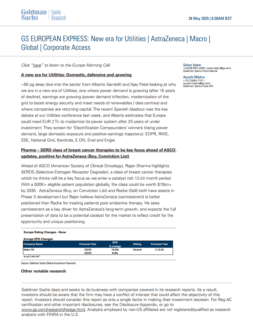 本报告全面分析了当前全球市场的多个关键领域,揭示了公用事业行业在电力需求增长和电网现代化投资驱动下的“新纪元”,并识别了EDPR、RWE等“电气化复合增长者”。在制药领域,SERD疗法被强调为乳腺癌治疗的重要突破,阿斯利康的camizestrant具有显著的市场潜力。宏观经济方面,欧洲央行对通胀和增长的预测为市场提供了指引,而科技和工业领域则展现出强劲的增长势头和并购活动。报告还详细列举了高盛在消费品、饮品、机械等行业的具体研究发现和公司评级调整,并提供了丰富的企业交流活动和研究资源,为投资者提供了多维度的市场洞察和投资参考。整体而言,报告强调了在复杂多变的市场环境中,通过深入数据分析和专业洞察来把握结构性增长机遇的重要性。