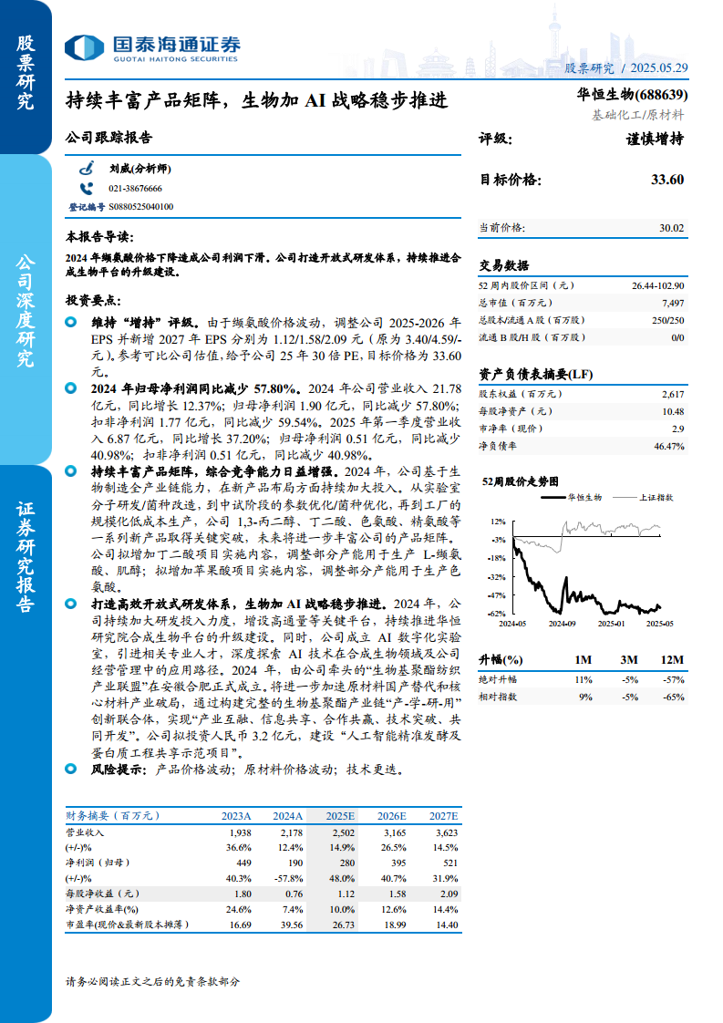 华恒生物在2024年及2025年第一季度面临缬氨酸价格下降带来的盈利压力,导致归母净利润大幅下滑,分析师因此下调了盈利预测并调整了目标价格。面对挑战,公司积极通过战略转型和创新应对,持续丰富产品矩阵,在新产品开发上取得突破,并优化产能配置。同时,公司大力推进“生物加AI”战略,加大研发投入,建设AI数字化实验室,并牵头成立产业联盟,旨在通过技术创新和产业协同提升核心竞争力。然而,公司仍需警惕产品价格、原材料价格波动以及技术更迭带来的市场风险。