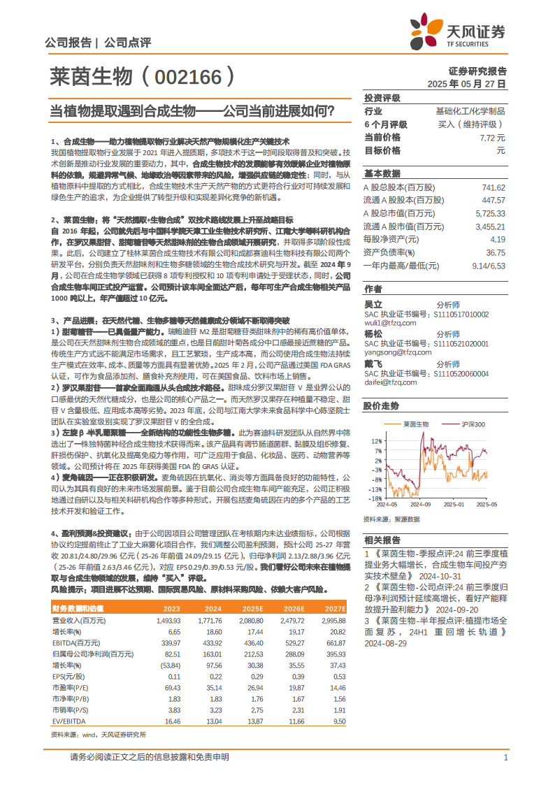 莱茵生物正积极响应植物提取物行业提质升级的趋势,将“天然提取+生物合成”双技术路线提升至公司战略高度。通过持续的研发投入、专利布局和生产设施建设,公司已在天然甜味剂(如甜菊糖苷M2、罗汉果甜苷V)和功能性生物多糖(如左旋β-半乳葡聚糖)等核心产品领域取得显著进展,并具备量产能力或实现关键技术突破。尽管因特定项目调整了短期盈利预测,但公司在合成生物领域的战略布局和产品创新能力,预示着其未来在天然健康成分市场具有广阔的增长空间和竞争优势。天风证券维持“买入”评级,看好公司长期发展。