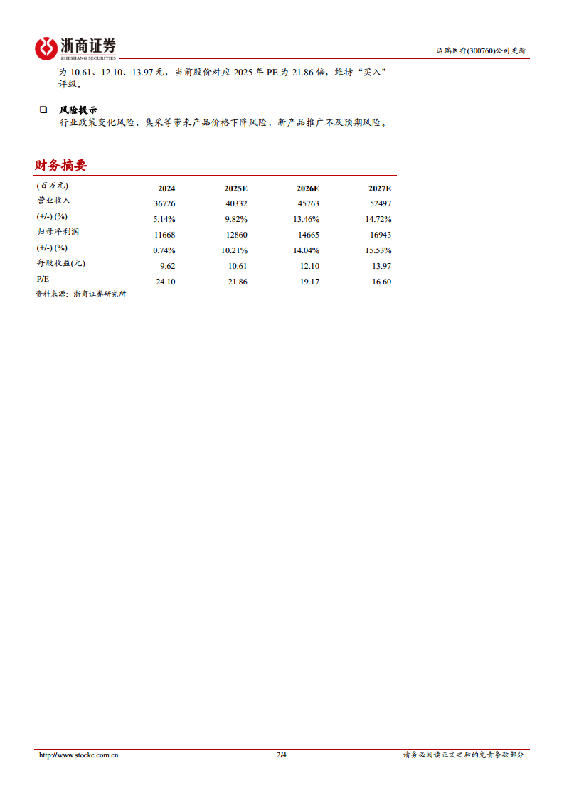 迈瑞医疗在2024年面临国内市场因地方财政紧张、医疗专项债减少及常规招标延误等因素带来的短期挑战,但公司凭借其在海外市场的持续高端客户突破、本地化平台完善以及全球均衡布局,实现了国际业务的强劲增长。预计2025年起,随着国内医疗专项债发行规模的恢复和招标活动的正常化,国内市场有望迎来拐点,与持续增长的国际业务共同驱动公司中长期稳步发展。