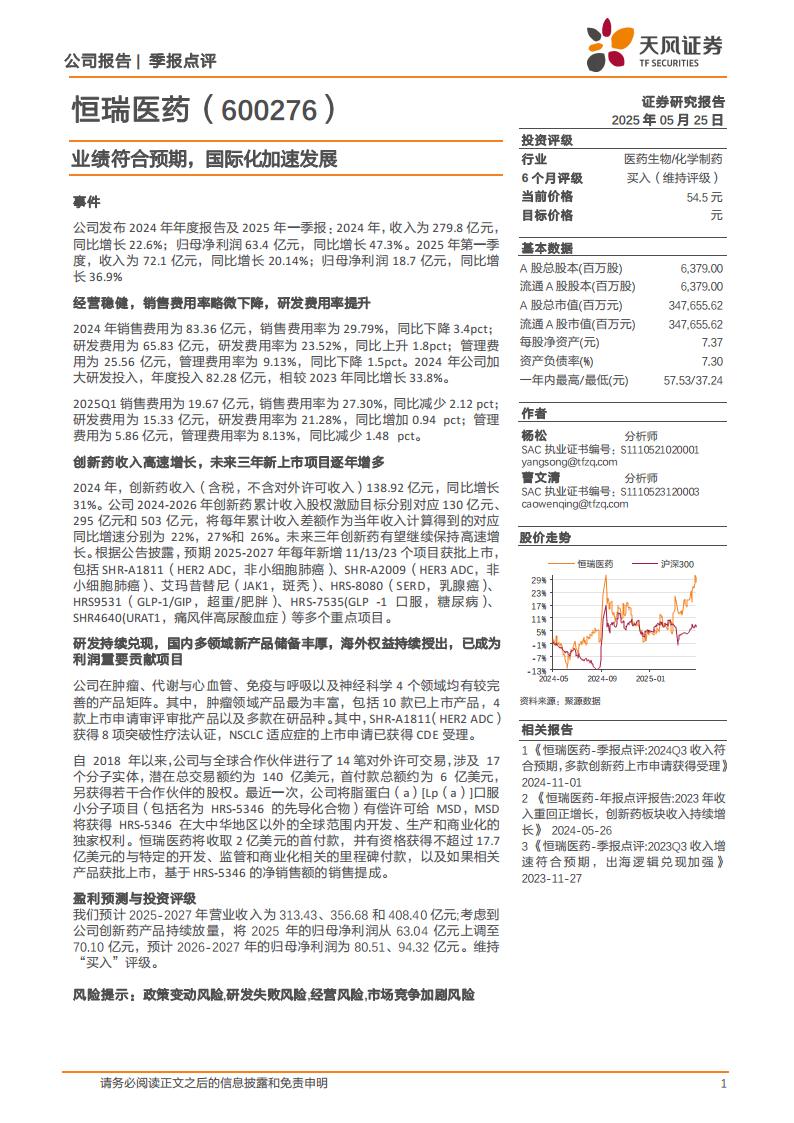 恒瑞医药在2024年及2025年第一季度取得了显著的业绩增长,营收和归母净利润均实现双位数提升。公司通过优化经营效率、持续加大研发投入,推动创新药业务高速发展,创新药收入占比不断提升,成为核心增长动力。同时,公司积极拓展国际市场,多项海外授权交易不仅带来了可观的经济效益,也彰显了其在全球医药市场的竞争力。展望未来,随着丰富的新药管线逐步上市和国际化战略的深入实施,恒瑞医药有望继续保持稳健增长态势,巩固其在创新药领域的领先地位。