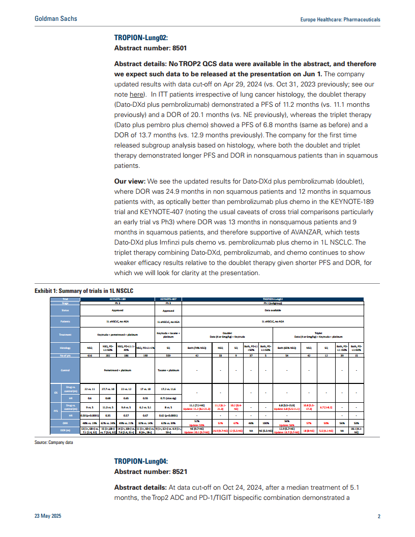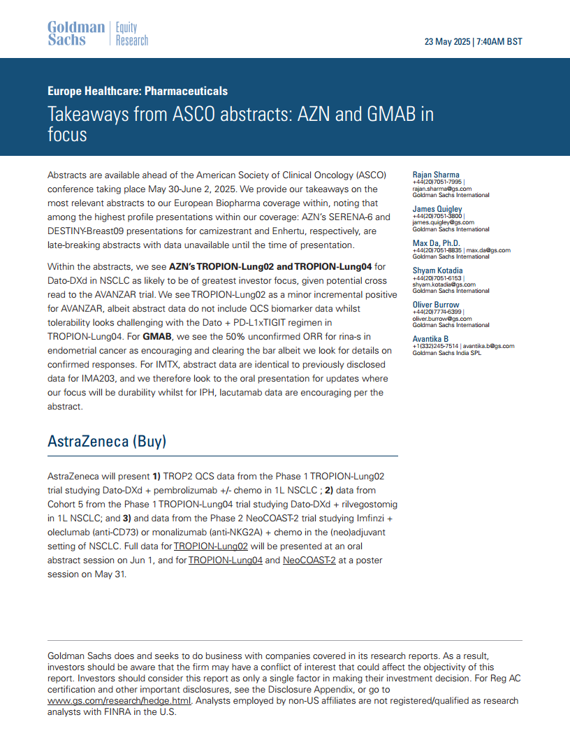 本报告总结了高盛对2025年美国临床肿瘤学会(ASCO)会议摘要的分析,重点关注欧洲生物制药领域的关键进展。报告核心观点在于,阿斯利康(AZN)在非小细胞肺癌(NSCLC)领域的Dato-DXd联合疗法展现出积极信号,尤其在TROPION-Lung02试验中双药疗法的持久缓解数据令人鼓舞,尽管TROPION-Lung04试验中TIGIT机制的安全性仍需谨慎。同时,Genmab(GMAB)的Rina-S在子宫内膜癌治疗中显示出卓越的疗效,远超现有标准,具备高度市场竞争力。Immatics(IMTX)和Innate Pharma(IPH)的更新数据也提供了各自管线药物的最新进展,为投资者提供了重要的市场洞察和投资决策依据。