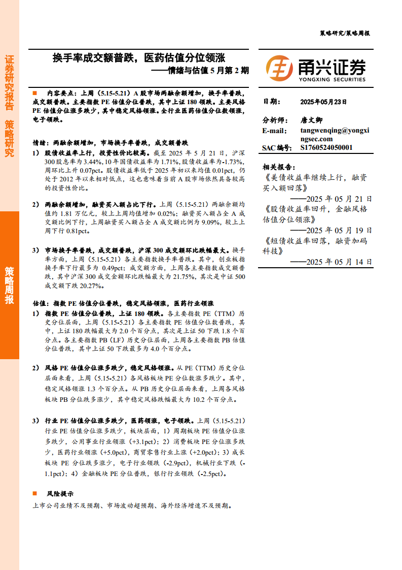 情绪与估值5月第2期:换手率成交额普跌,医药估值分位领涨