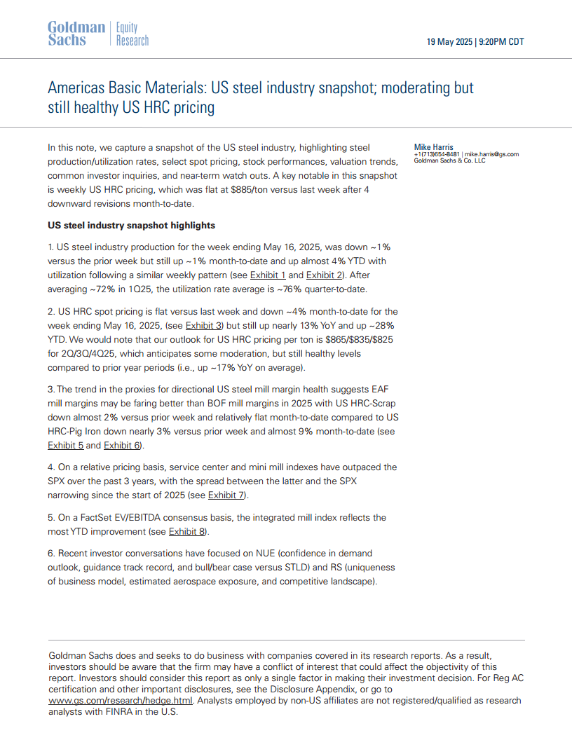 截至2025年5月16日当周,美国HRC现货价格为885美元/吨,与前一周持平,但月度累计下降约4%。尽管如此,该价格仍较去年同期上涨近13%,年初至今上涨约28%。高盛预计2025年第二、第三和第四季度HRC价格分别为865美元/吨、835美元/吨和825美元/吨,预示价格将适度回调,但与往年同期相比仍处于健康水平(平均同比上涨约17%)。