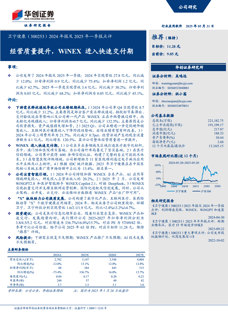 卫宁健康(300253):2024年报及2025年一季报点评:经营质量提升,WiNEX进入快速交付期