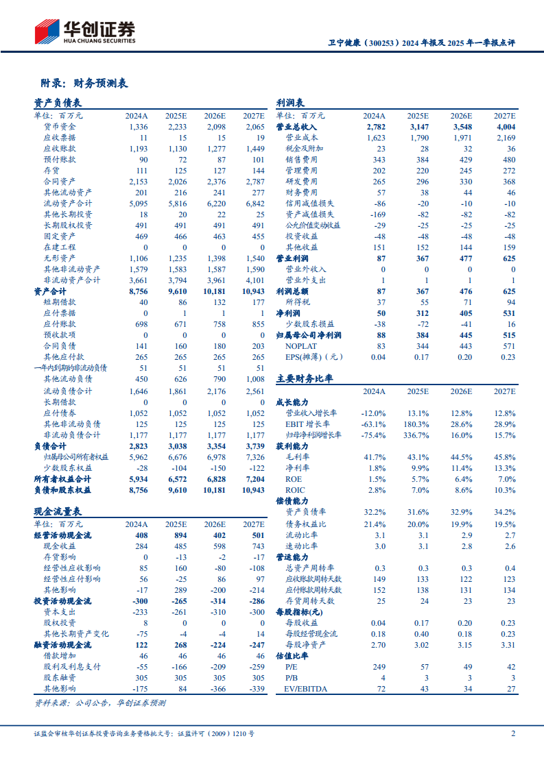 华创证券维持对卫宁健康的“推荐”评级,目标价11.28元。预计公司2025-2027年归母净利润分别为3.8亿元、4.5亿元和5.2亿元,对应增速为336.7%、16.0%和15.7%,对应PE分别为57倍、49倍和42倍。主要风险包括下游需求恢复不及预期、WiNEX产品推广不及预期以及AI技术发展不及预期。