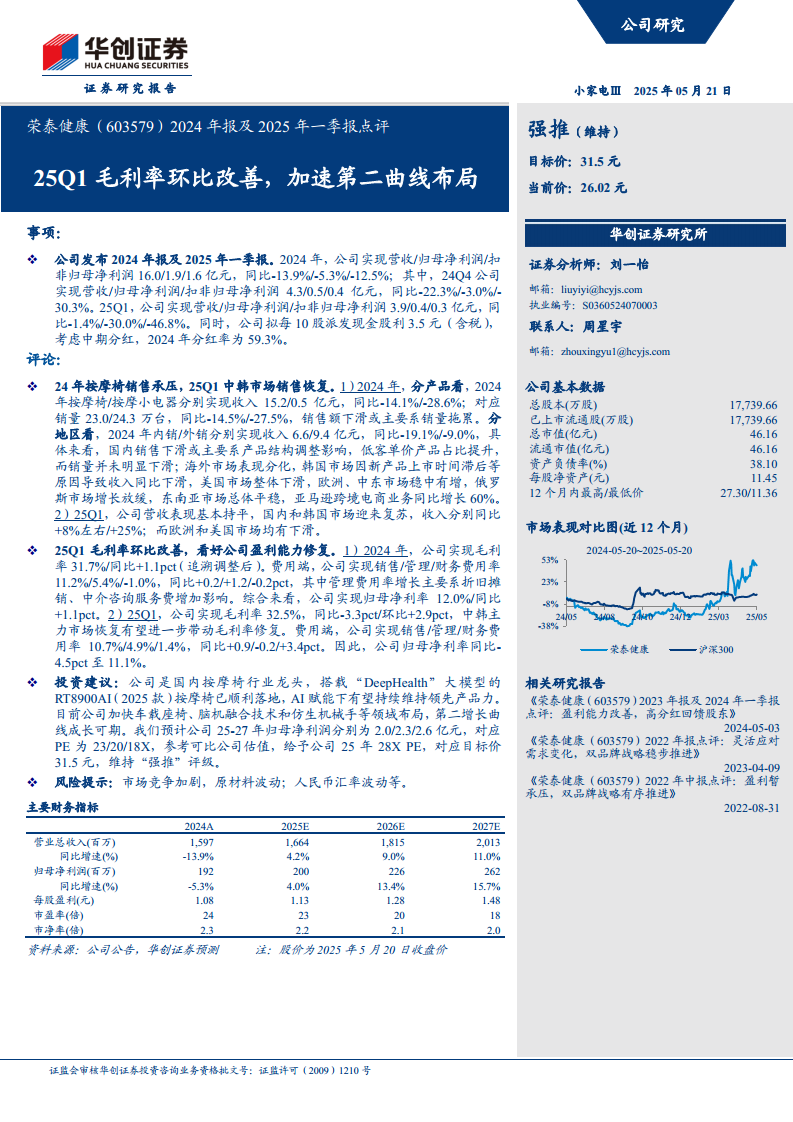 荣泰健康在2024年面临营收和利润下滑的挑战,但通过产品结构调整和海外市场拓展,部分市场表现出韧性。2025年第一季度,公司毛利率环比改善,国内和韩国市场销售回暖,显示出一定的复苏迹象。公司积极拥抱AI技术,推出AI赋能的按摩椅产品,并前瞻性布局车载座椅、脑机融合等第二增长曲线,有望在未来市场竞争中保持领先地位。华创证券基于公司在产品创新和新业务拓展方面的潜力,维持“强推”评级,并对未来业绩增长持乐观预期,但同时提示了市场竞争、原材料和汇率波动等风险。