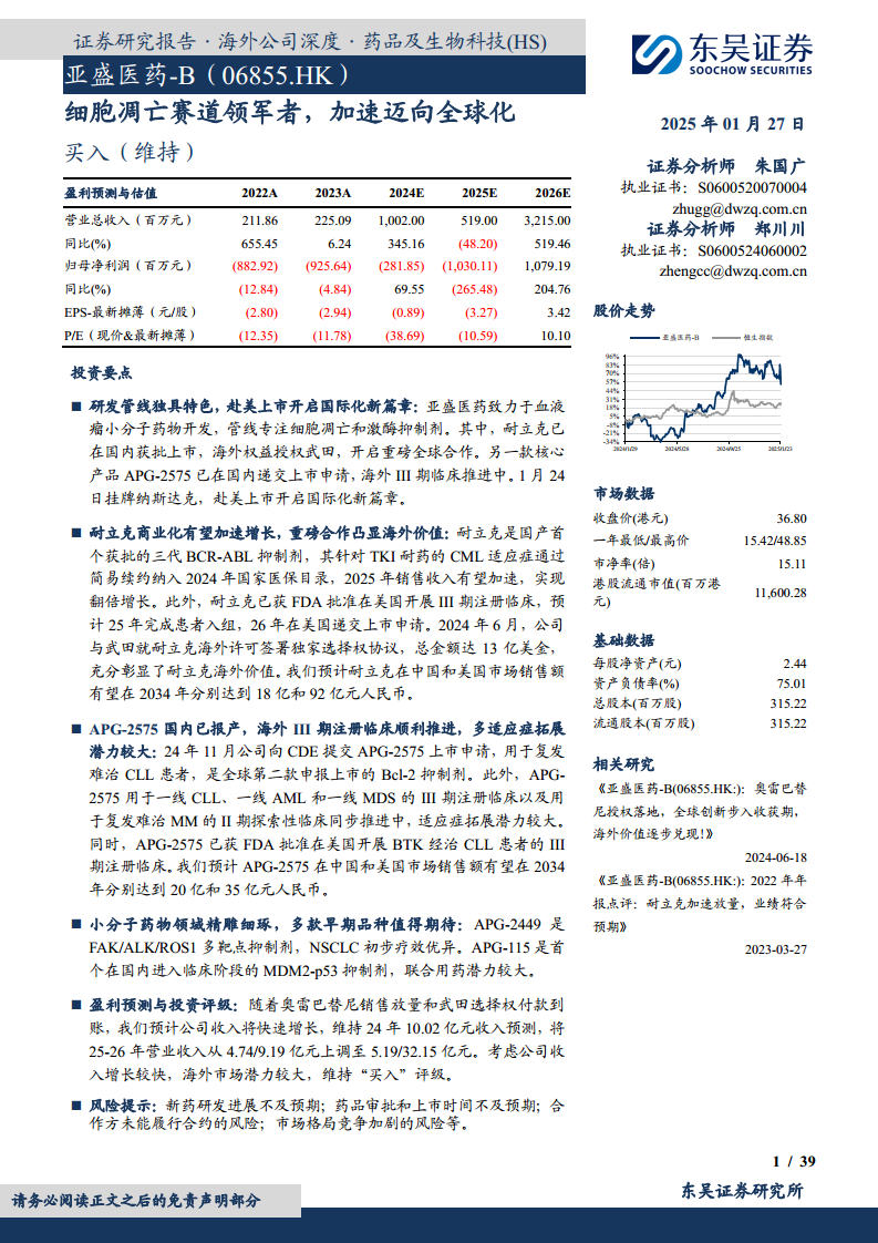 小分子药物研发独具特色,商业化、全球化进程加速 亚盛医药是一家立足中国、面向全球的创新药研发企业,专注于肿瘤、乙肝及衰老相关疾病治疗领域。公司于2019年在香港联交所上市,并于2025年1月24日成功挂牌纳斯达克,成为2025年首家在美上市的生物医药公司,标志着其国际化战略迈入新阶段。此次赴美上市预计募集净额1.13亿至1.31亿美元,将主要用于APG-2575在中国的上市筹备及海外临床试验、奥雷巴替尼在美国等国的临床试验推进和上市筹备,以及APG-5918等早期候选产品的临床开发,为公司管线顺利推进提供长期融资支持。